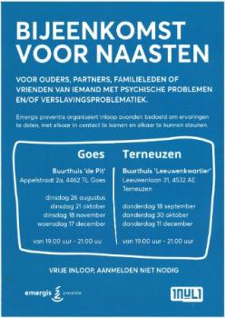 Voor ouders, partners, familieleden of vrienden van iemand met psychische problemen en/of verslavingsproblematiek. Vrije inloop, aanmelden niet nodig.